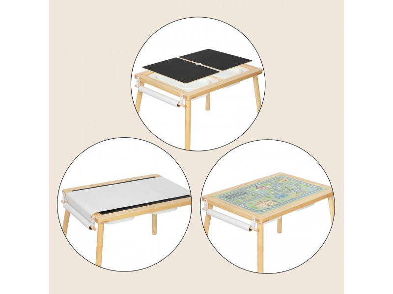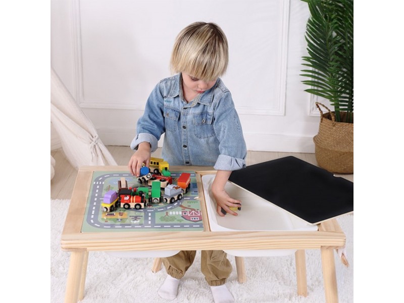 - - Dwustronny blat, z jednej strony mapa miasta po której można jeździć samochodzikami, z drugiej czarna tablica do rysowania i pisania kredą