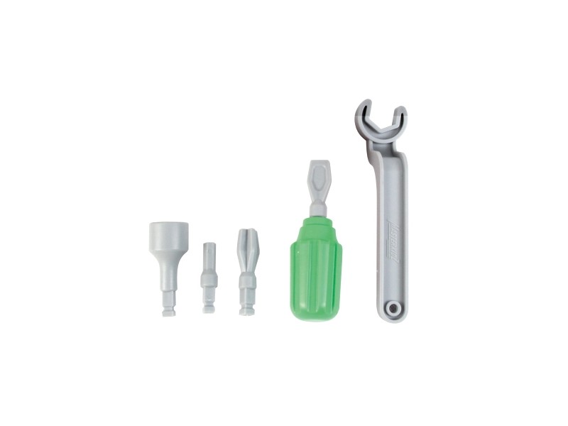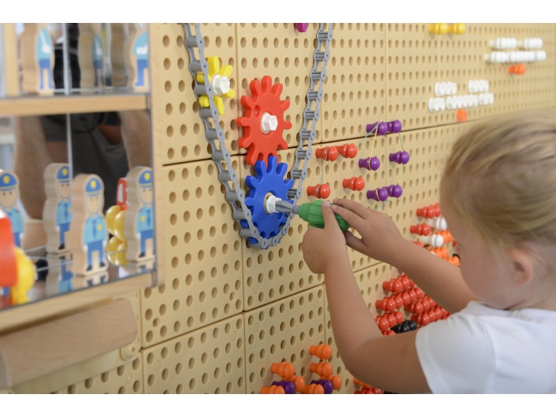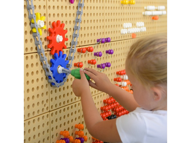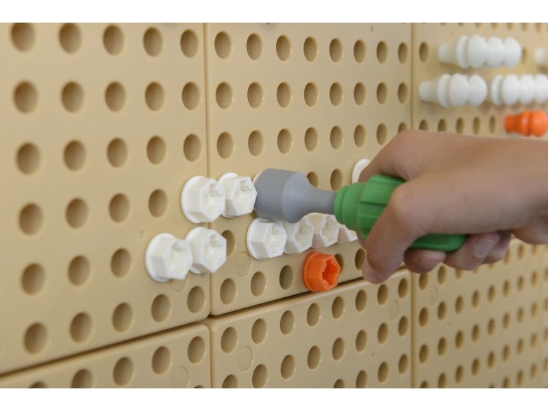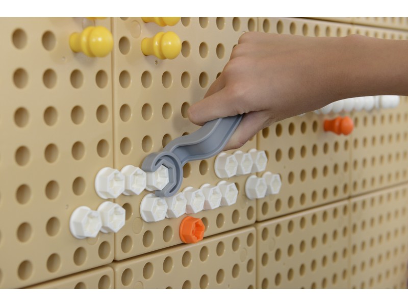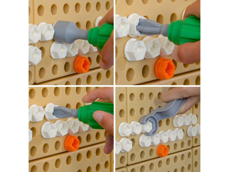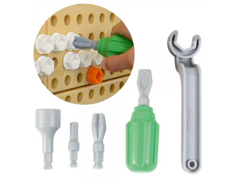 W zestawie ręcznych narzędzi do ścianki Naukowo-Kreatywnej Masterkidz, znajduje się śrubokręt z 4 wymiennymi końcówkami, oraz klucz. Taki zestaw pozwala dziecku na poznanie różnego rodzaju narzędzi, nauczenia się jak ich poprawnie używać, oraz na kreowanie z ich pomocą przepięknych obrazków na tablicy STEM.