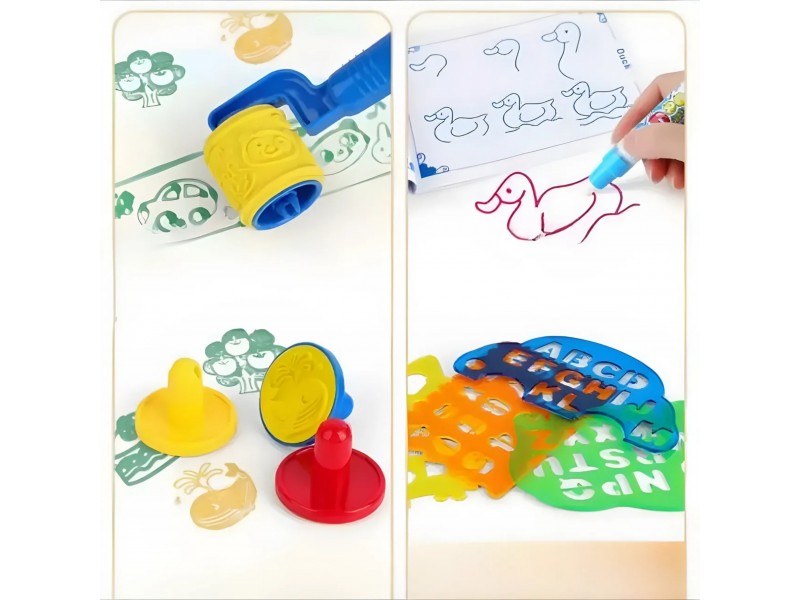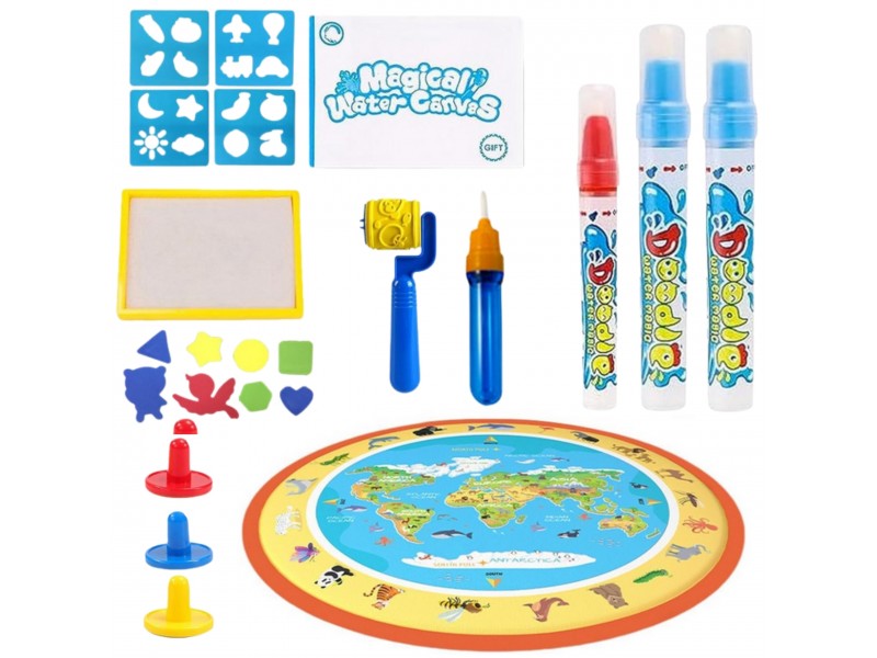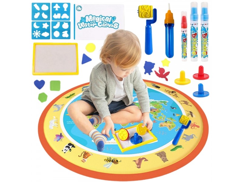 Magiczna mata wodna Magical Water Canvas od marki Woopie to kreatywna i edukacyjna zabawka, która zachwyci każde dziecko. Dzięki specjalnym pisakom wodnym malowanie jest całkowicie bezpieczne – wystarczy woda, aby tworzyć niesamowite rysunki i wzory. Kolorowa mapa świata z zaznaczonymi zwierzętami sprawia, że zabawa staje się także okazją do nauki geografii i poznawania przyrody. W zestawie znajdują się liczne akcesoria: stempelki, szablony, wałek, pisaki i gąbka – które urozmaicają twórczość. To idealny pomysł na prezent, który rozwija wyobraźnię i gwarantuje godziny radosnej zabawy bez bałaganu.